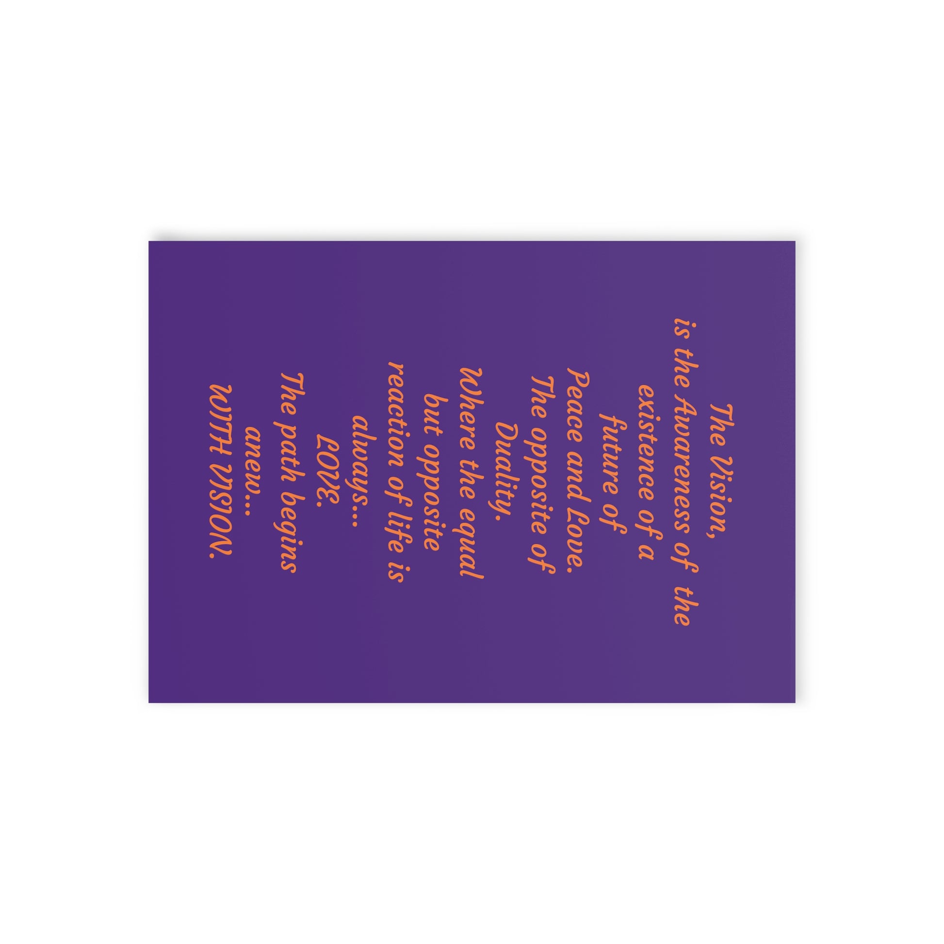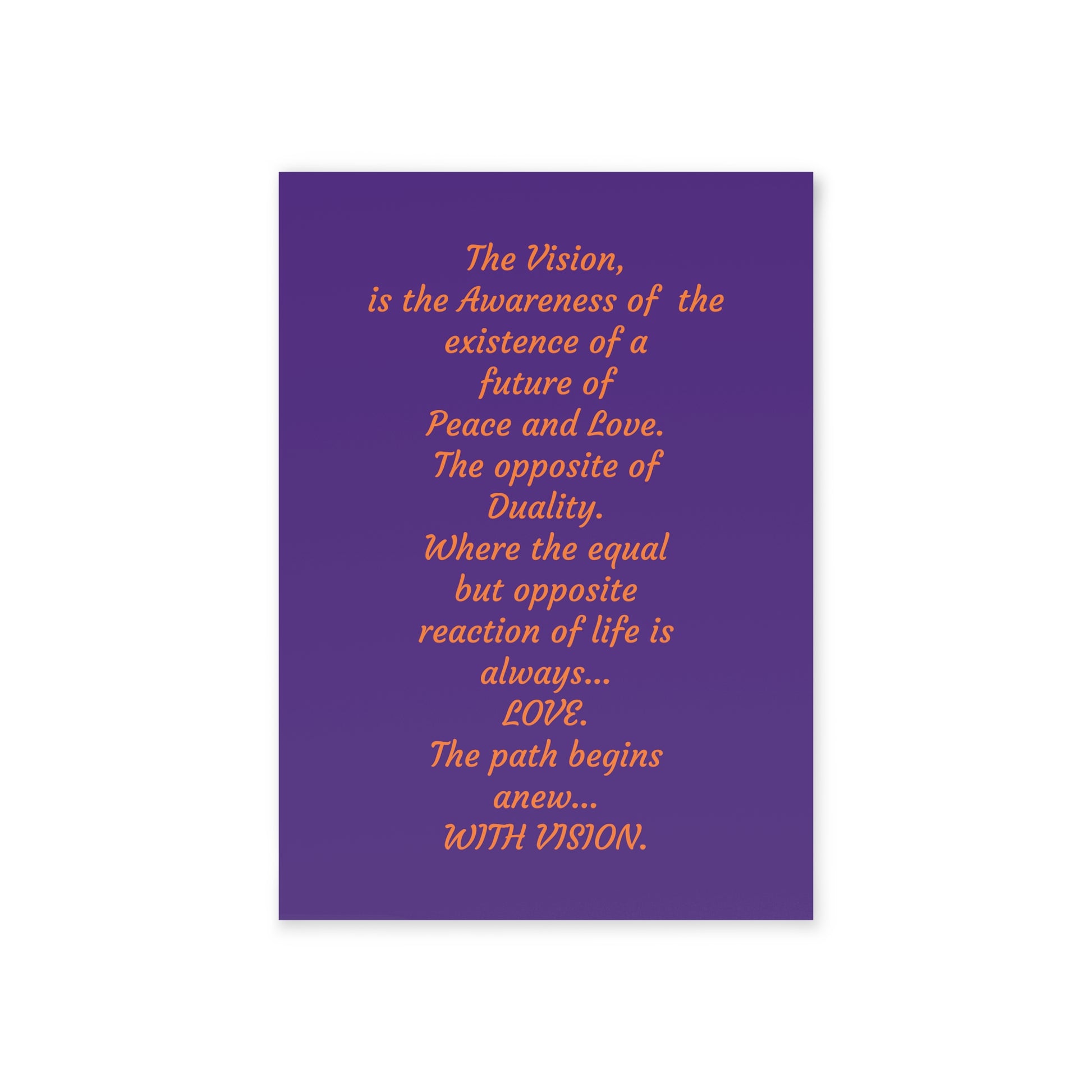 The Vision, is the Awareness of the Existence of a future of Peace and Love. The opposite of Duality where the equal but opposite reaction of life is always LOVE. The path begins anew... WITH VISION.